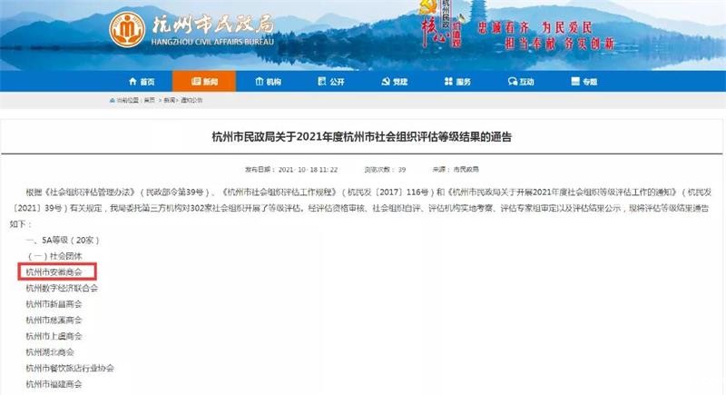 2021年10月18日,杭州市民政局发布《关于2021年度杭州市社会组织评估等级结果的通告》,杭州市安徽商会被评估为“5A等级社会组织”,喜获社会团体最高等级的社会组织荣誉。