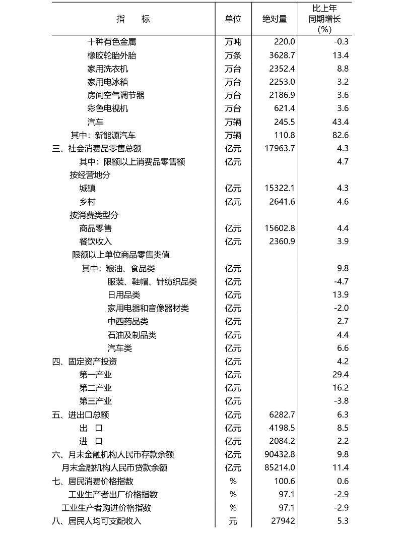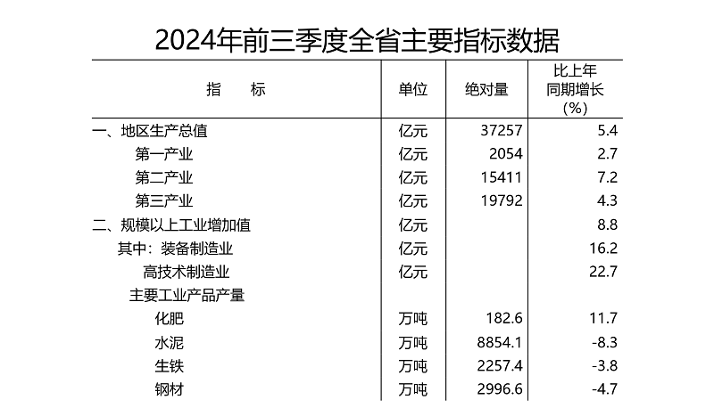 根据地区生产总值统一核算结果,前三季度全省地区生产总值37257亿元,按不变价格计算,同比增长5.4%。分产业看,第一产业增加值2054亿元,增长2.7%;第二产业增加值15411亿元,增长7.2%;第三产业增加值19792亿元,增长4.3%。