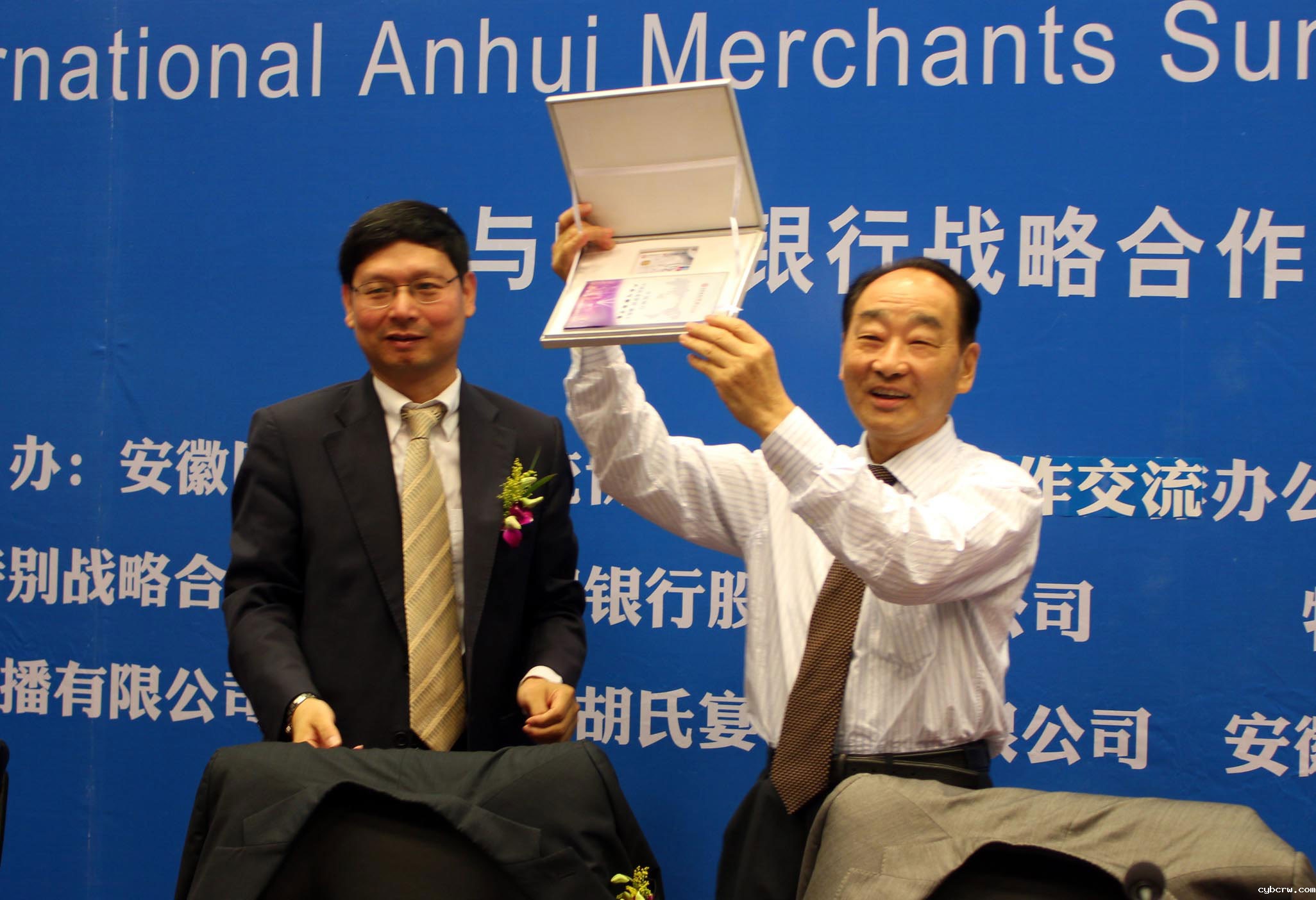 中国银行总行个人金融部总监高树钢先生向bv伟德体育app会长周本立先生赠送首批“中银财富管理•徽商卡”