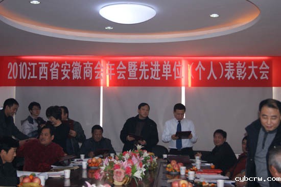 会议表彰了在2010年取得优异成绩的10家会员单位和8位先进个人。共青城宣传统战部部长张浔致辞,大会由党支部书记、常务副会长曹以德主持,江西省安徽商会年会会长孙仁凌做总结讲话。