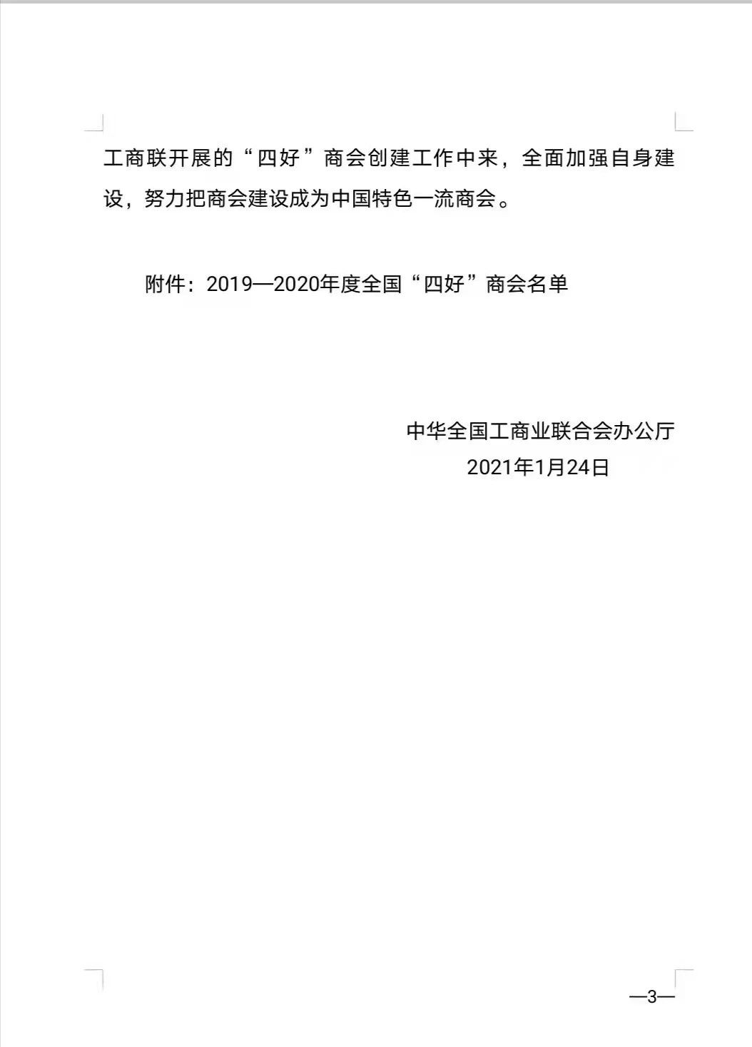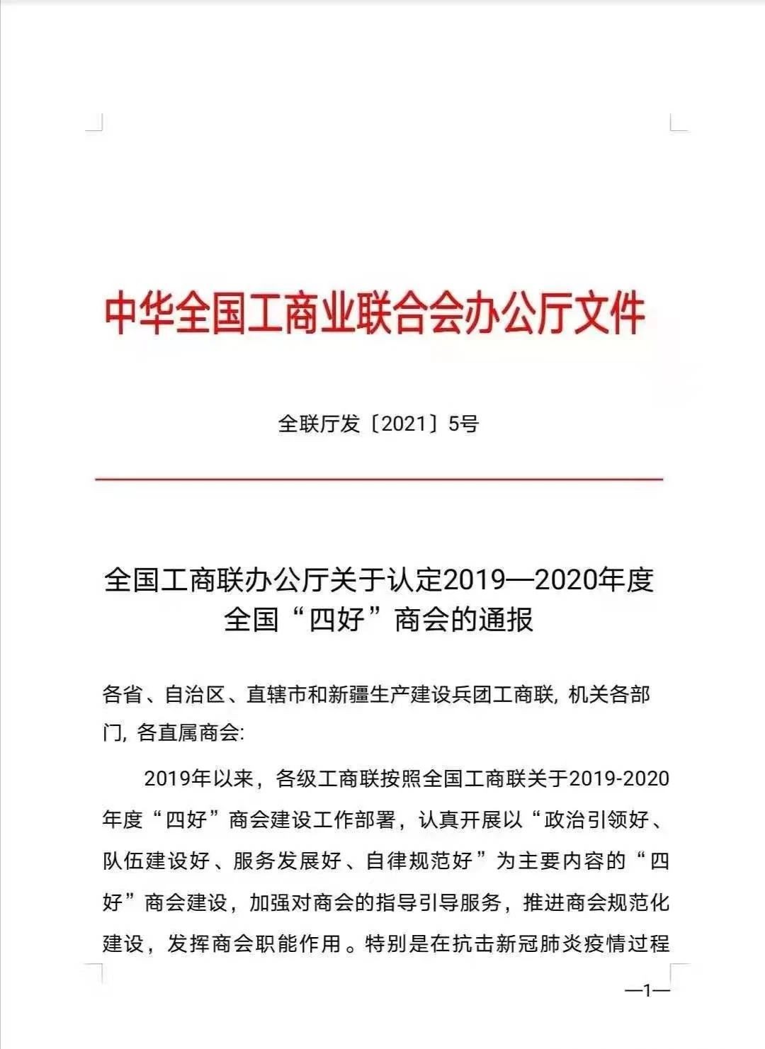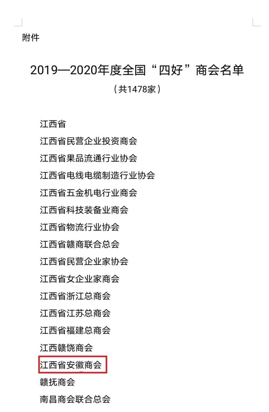 砥砺进取捷报传,奋发有为勇当先。2021年1月24日,中华全国工商业联合会办公厅发布《全国工商联办公厅关于认定 2019—2020 年度全国“四好”商会的通报》(中华全国工商业联合会办公厅文件全联厅发〔2021〕5 号),江西省安徽商会(下称“商会”)榜上有名,被认定为“2019-2020年度全国‘四好’商会”。获此殊荣,离不开省工商业联合会(总商会)、省民政厅、省商务厅行业综合党委等部门的正确指导,离不开全体会员的共同努力。这不仅是商会的荣誉,也是每一位会员的荣誉,荣誉的获得,体现了全国工商联、省工商联及社会各界对商会过去两年工作的认可和肯定,也是对商会未来工作的鞭策和鼓励,荣誉的背后,凝聚了商会领导班子精诚团结、广大会员鼎力支持的结晶,商会将珍惜荣誉不断前行,再树江西徽商新形象。今后,商会在李井海会长的带领下必将努力珍惜这份荣誉,认真学习贯彻党的十九大精神,不忘初心,牢记使命,继续大力弘扬新时代徽商精神,切实加强对商会各项工作的引领,把深入学习贯彻习近平总书记系列重要讲话精神作为推动商会改革发展的根本遵循,把“两个健康”主题贯彻落实到商会建设的各个方面和各个环节,为赣皖两地民营经济的高质量发展做出更大的贡献。(文/叶文榜)