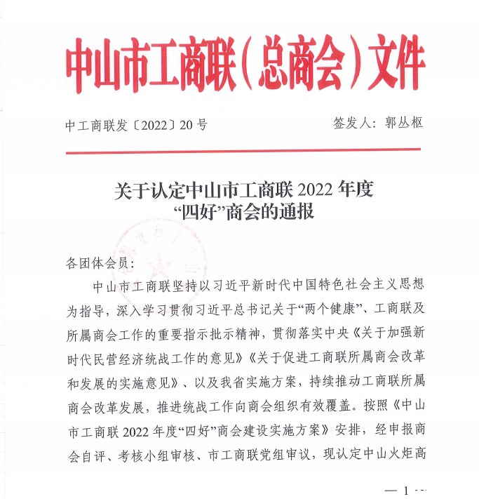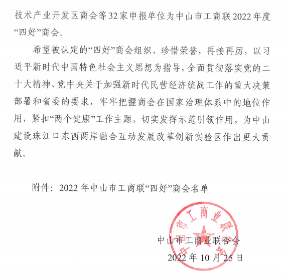 近日,中山市工商联(总商会)发布《关于认定中山市工商联2022年度“四好”商会的通报》,中山市安徽商会获评中山市工商联2022年度“四好”商会荣誉称号。