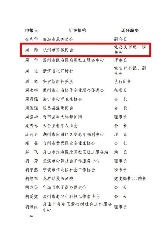 近日,浙江省民政厅公布2022近日,浙江省民政厅公布2022年浙江省品牌社会组织和社会组织领军人物评选名单。杭州市安徽商会党总支书记兼秘书长周帅荣获2022年浙江省社会组织领军人物。年浙江省品牌社会组织和社会组织领军人物评选名单。杭州市安徽商会党总支书记兼秘书长周帅荣获2022年浙江省社会组织领军人物。