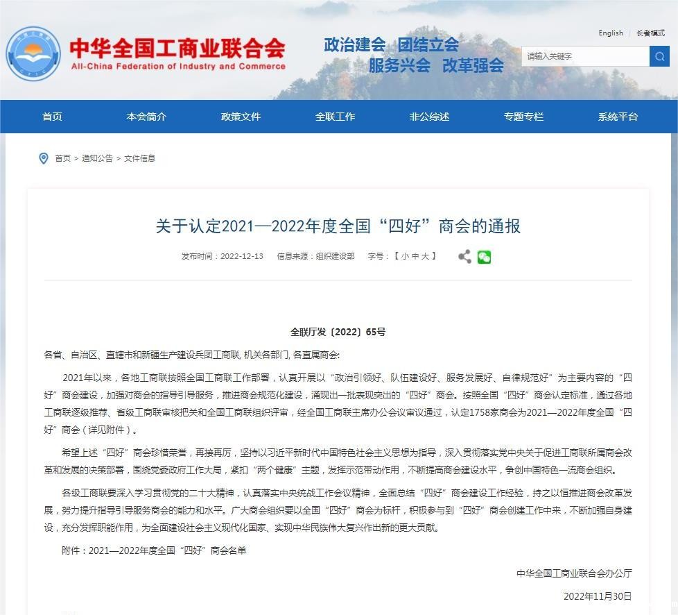 近日,全国工商联办公厅发布了《关于认定2021-2022年度全国“四好”商会的通报》(全联厅发〔2022〕65号)。