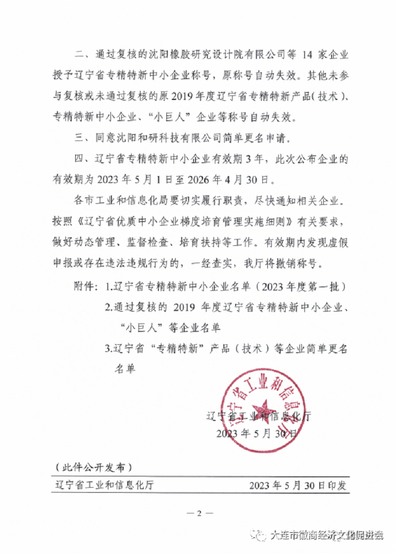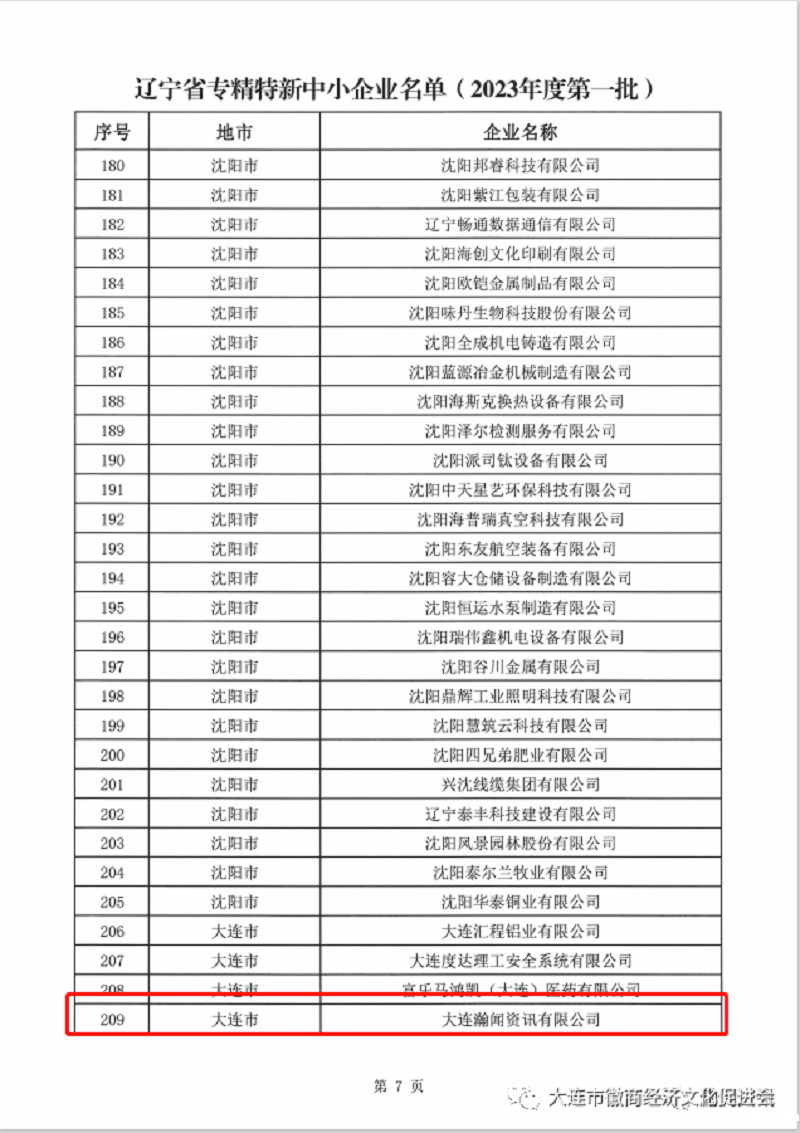 日前,从辽宁省工信厅的公开文件中获悉,大连市徽商经济文化促进会会长童友俊企业——大连瀚闻资讯有限公司被确认为辽宁省级“专精特新”中小企业,这是大连瀚闻资讯有限公司继2020年被工信部确认为“建议支持的“专精特新”中小企业公共服务示范平台、2021年被工信部确认为“国家级中小企业公共服务示范平台”、2022年被辽宁省工信厅确认为“辽宁省级中小企业公共服务示范平台”、2022年被大连市工信局确认为“大连市中小企业公共服务示范平台”后,取得的又一个重要资质。