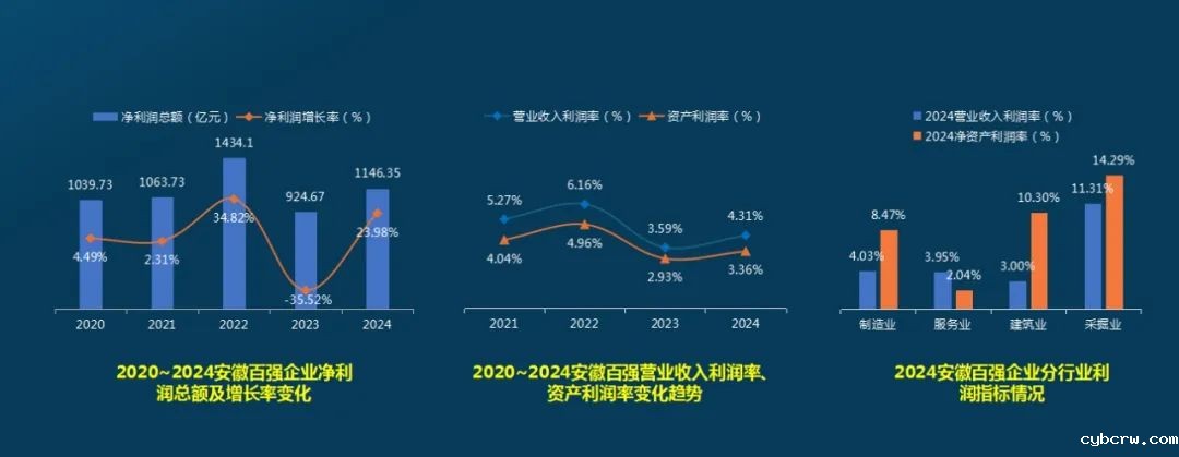 从利润上看,2024安徽百强企业净利润总额达到1146.35亿元,净利润增长率为23.98%。营业收入利润率和资产利润率分别较上年增加0.72和0.43个百分点。