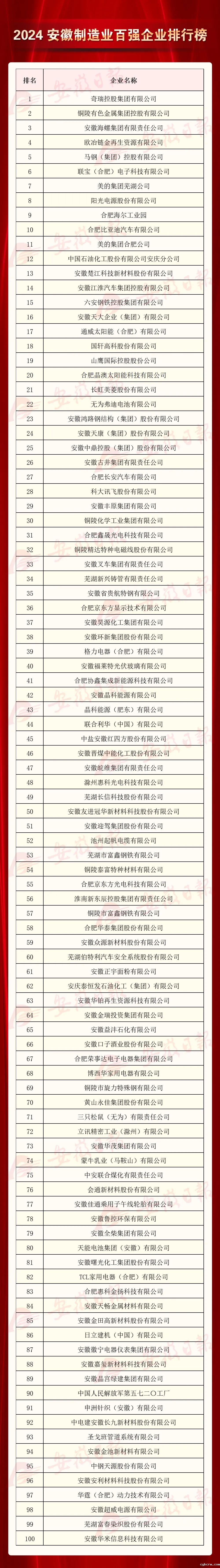 其中,奇瑞控股集团有限公司以2767.4亿元的营业收入居2024安徽百强企业、2024安徽制造业百强企业的首位,铜陵有色金属集团控股有限公司、安徽海螺集团有限责任公司分别居第二、三位。