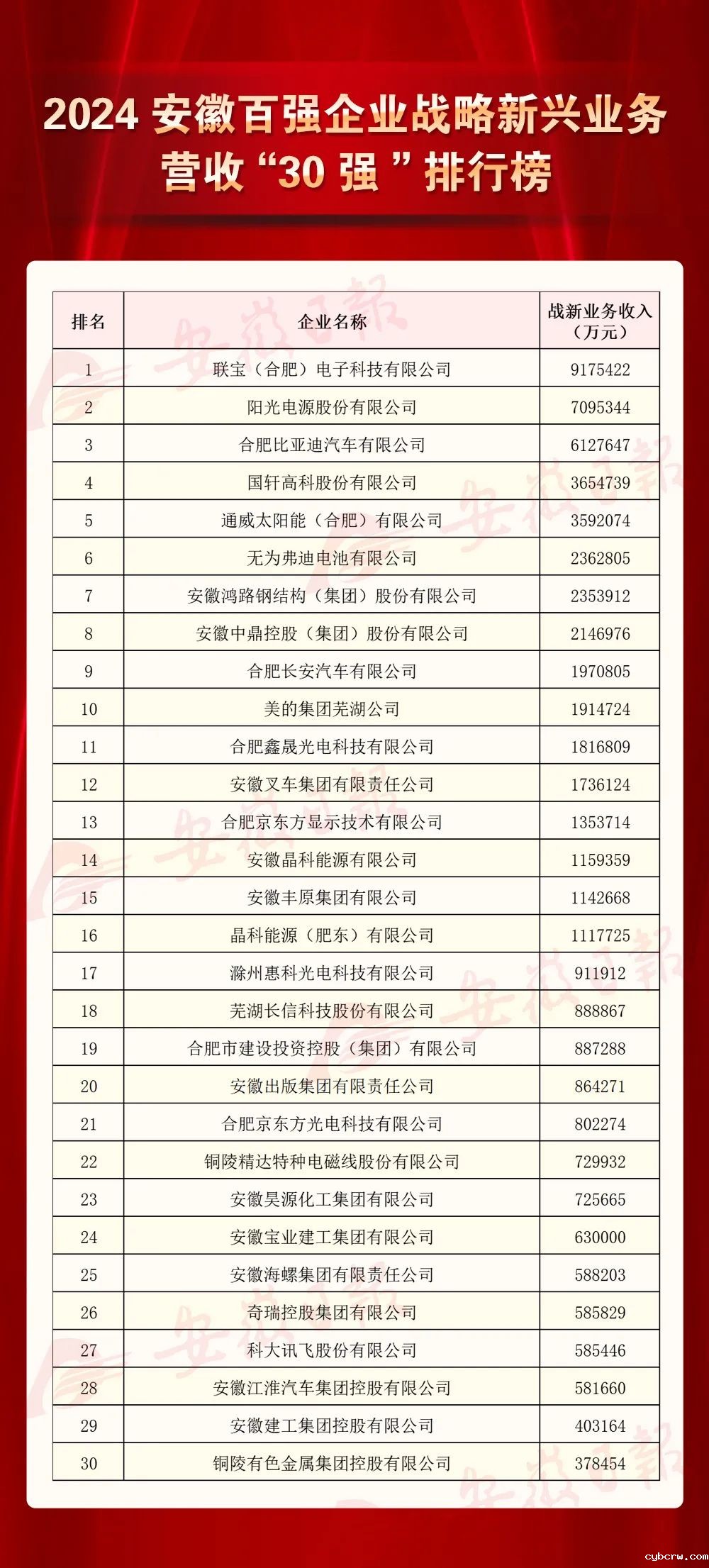 今年还特别评选了2024安徽百强企业战略新兴业务营收“30强”,联宝(合肥)电子科技有限公司以917.5亿元的战新业务收入排名榜首。