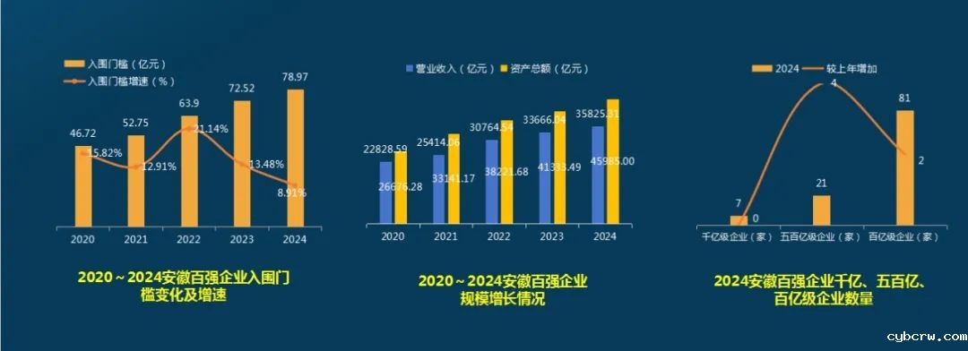 值得关注的是,2024安徽百强企业的入围门槛快速提升,达到78.97亿元,较上年增长8.91%;营业收入总额超过3.58万亿元,资产总额达到4.6万亿元,分别上升6.41%和11.25%。