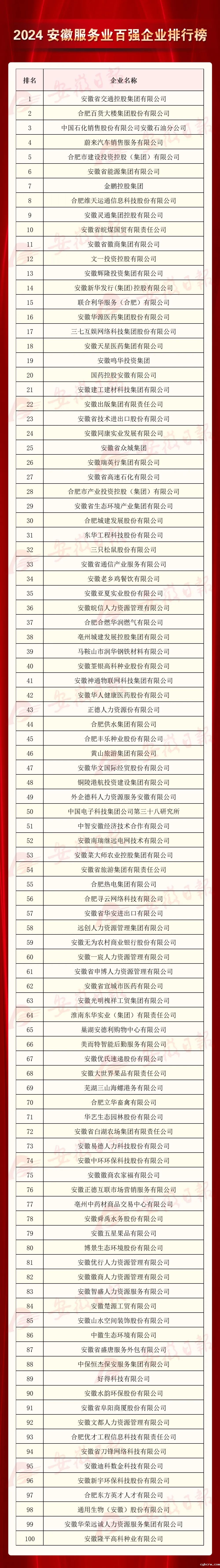 在2024安徽服务业百强企业排行榜中,安徽省交通控股集团有限公司、合肥百货大楼集团股份有限公司、中国石化销售股份有限公司安徽石油分公司分别位居前三位。