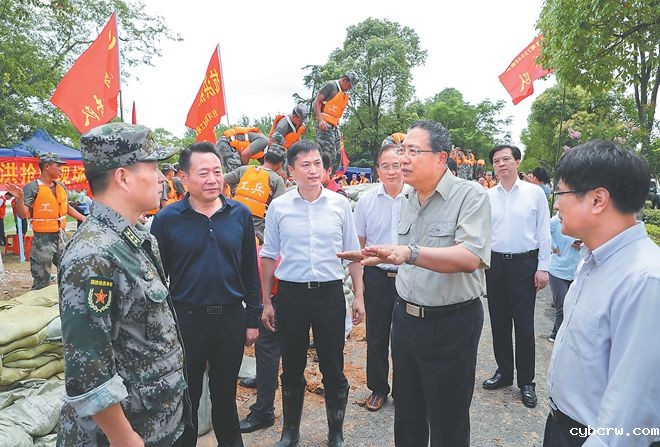 7月23日下午,省委书记李锦斌深入合肥市包河区环巢湖大堤万年埠段,看望慰问正挥汗如雨抢筑防浪子堤的人民子弟兵,督导检查防汛救灾工作。记者 徐国康摄