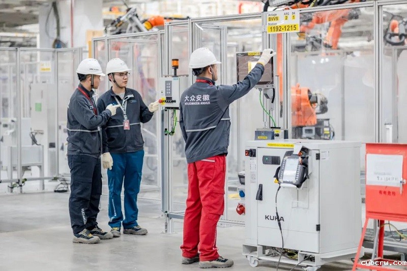 大众安徽MEB工厂车身车间内,工作人员正在监测设备运行状态。