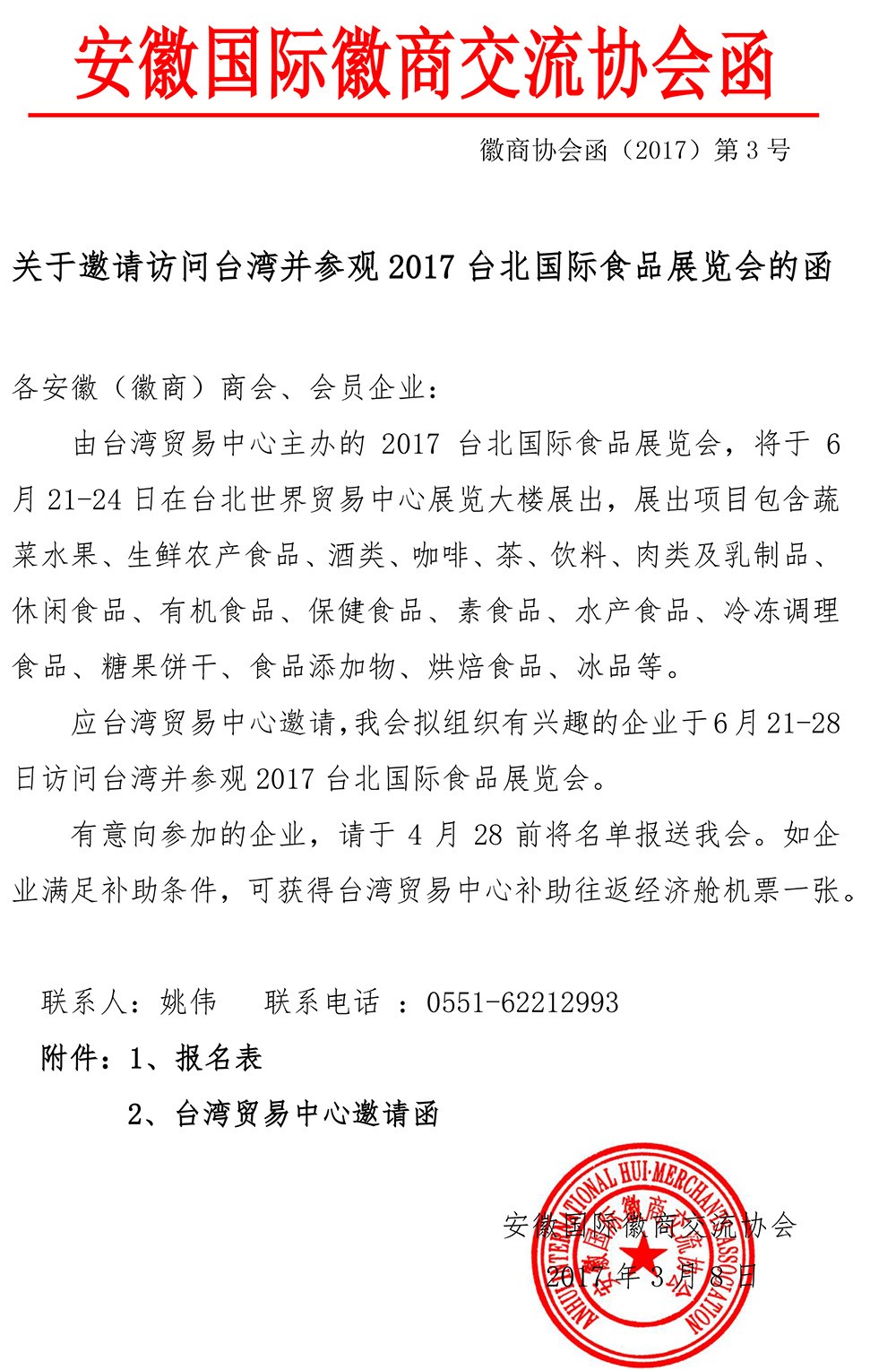 关于邀请访问台湾并参观2017台北国际食品展览会的函