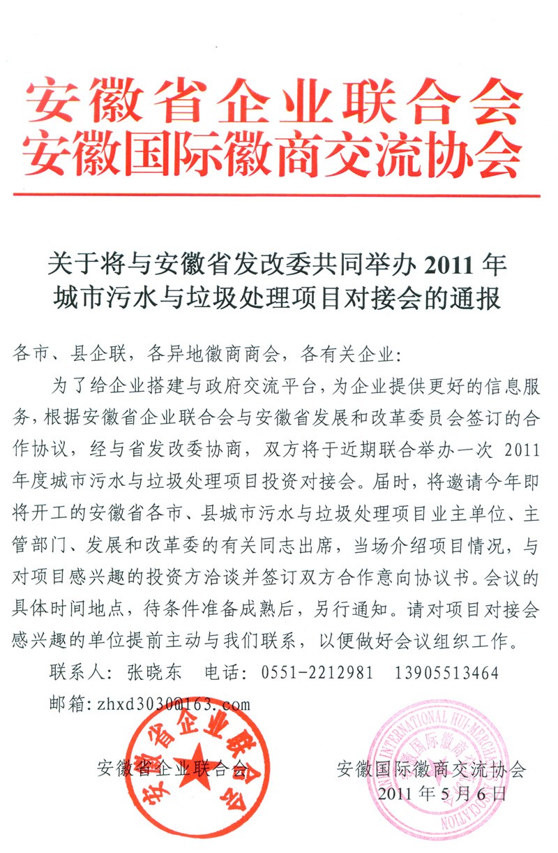 关于将与安徽发改委共同举办2011年城市污水与垃圾处理项目对接会的通报