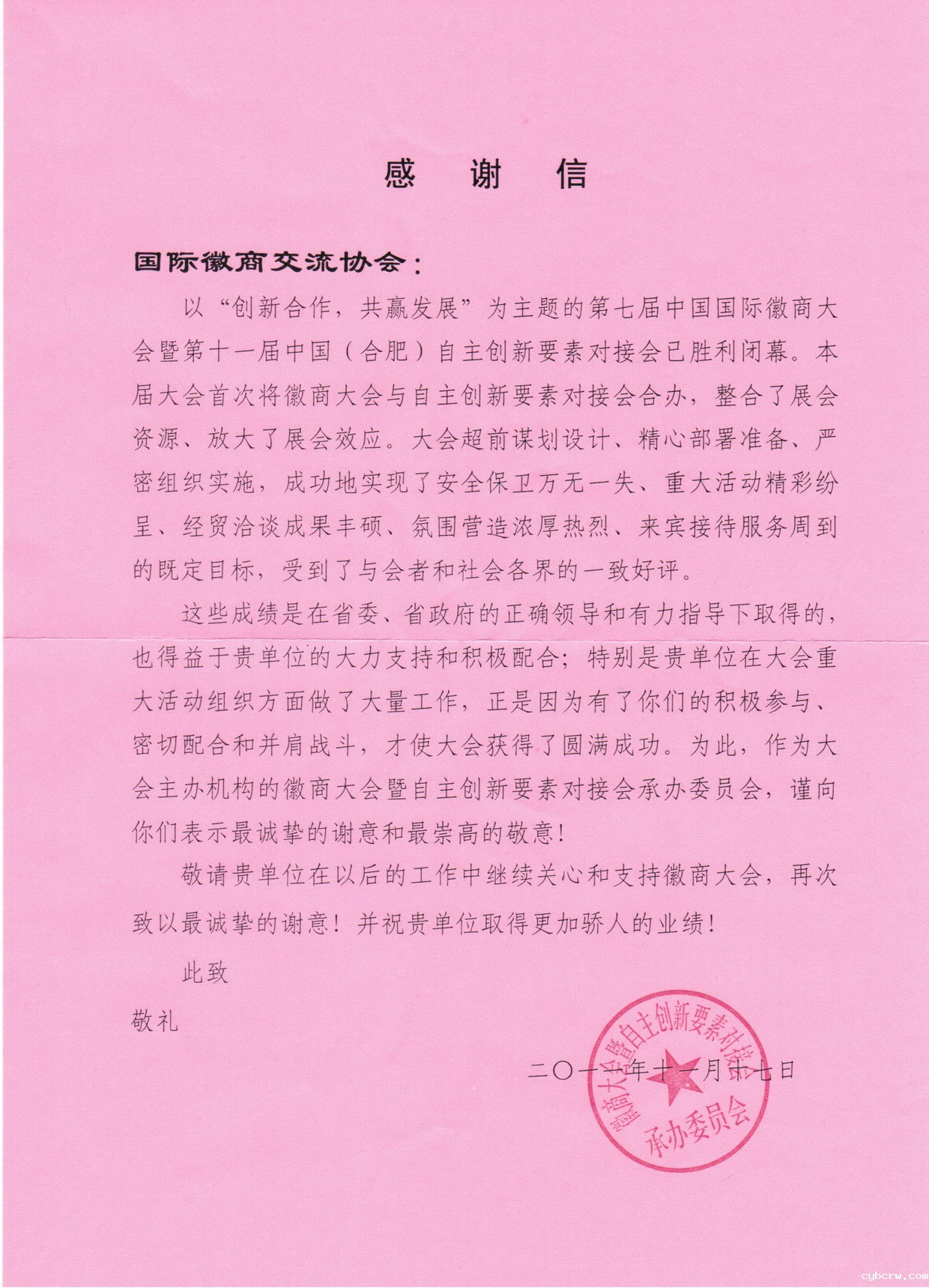 徽商大会暨自主创新要素对接会承办组委会给bv伟德体育app的感谢信