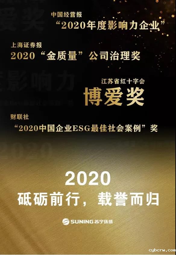 2020年, 苏宁环球凭借深远的品牌影响力和卓越的运营管理能力荣获“金智奖”2020中国房地产上市公司产品服务奖、“2020年度影响力企业”、“2020中国企业ESG最佳社会案例”、2020“金质量”公司治理奖。
