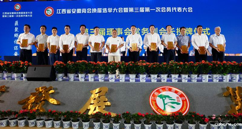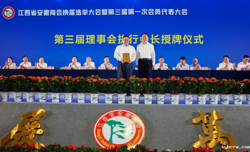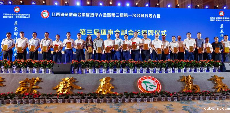 安徽省人民政府副秘书长左俊,江西省工商联党组成员、副主席谢松岳向新当选的省安徽商会终身荣誉会长李井海,第三届理事会会长张传厚、执行会长王斌授牌。