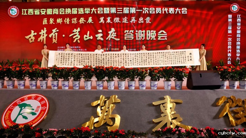 当晚,在香格里拉大酒店举行古井贡·黄山之夜--江西省安徽商会第三届第一次会员代表大会庆典答谢晚会。联欢晚会上,精彩节目在一片欢乐、祥和的气氛中不断的进行。安徽省黄梅剧院国家一级演员、中国戏剧梅花奖获得者、享受国务院颁发的特殊津贴、安徽省学科技术带头人、安徽省拔尖人才称号、安徽省非物质文化传承人孙娟;安庆市黄梅戏艺术剧院国家二级演员、攻小生、第四届全国黄梅之星青年演员电视大赛“黄梅之星”奖获得者,首届全国黄梅戏青年演员广播大赛“优秀演员”奖卢宇,表演的黄梅戏联唱《十五的月亮为谁圆》《对花》《夫妻双双把家还》等诙谐喜庆、熟悉的曲调,赢得了在场嘉宾笑声不断。美妙的歌声和美轮美奂的舞蹈表演给大家带来美的享受,穿插在文艺演出间的抽奖活动更是带来更多惊喜,整个晚宴过程,处处洋溢着欢歌笑语和浓浓的乡情。晚宴最后,一卷《徽商赋》长轴特别赠予bv伟德体育app。该赋由江西省安徽商会党支部书记、秘书长叶文榜撰写,由江西省安徽商会第三届理事会常务副会长刘梦吟书写。