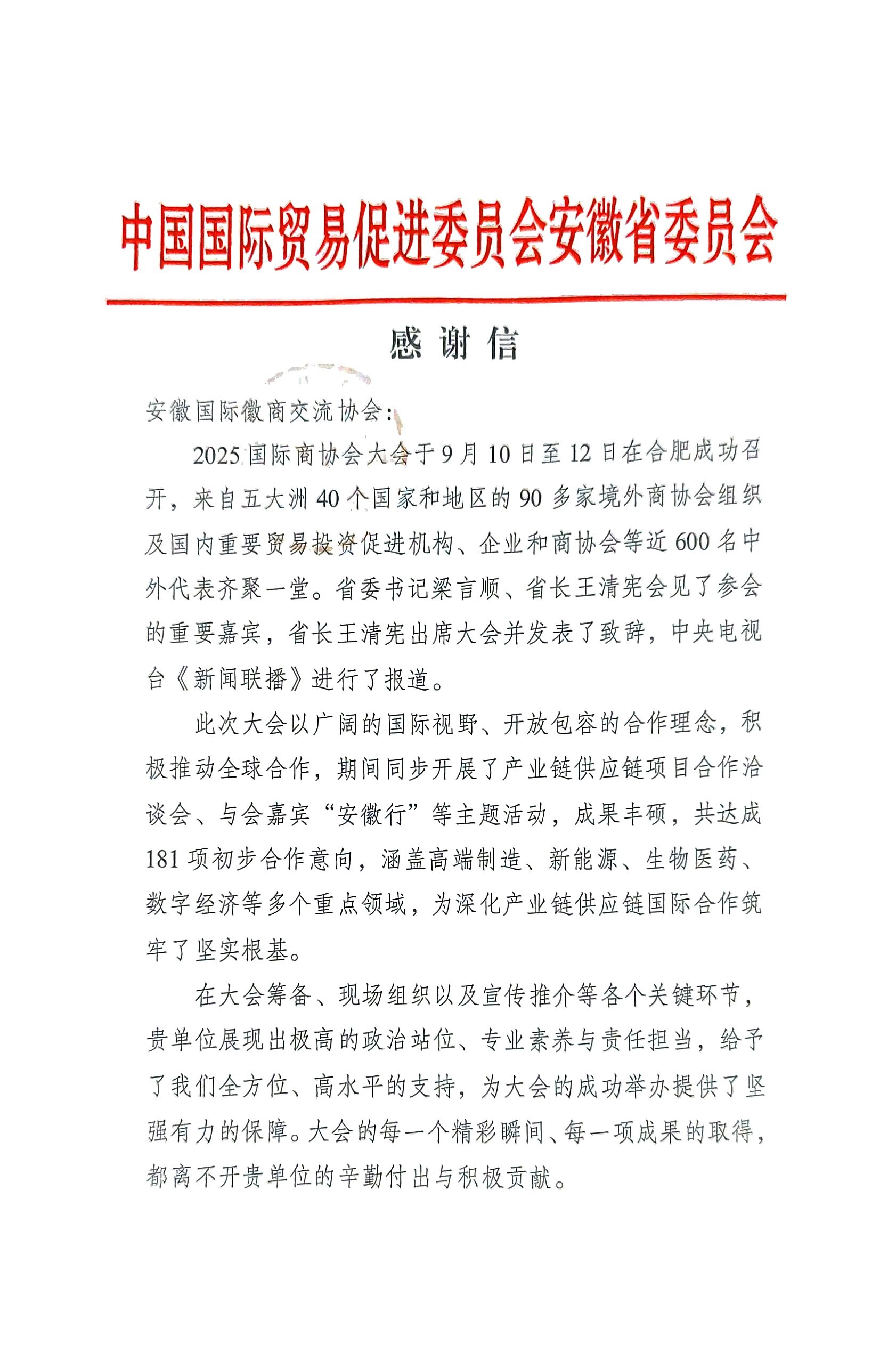 近日,我会收到中国国际贸易促进委员会安徽省委员会的感谢信,期待与其在未来深化合作,充分发挥桥梁纽带作用,携手共进。